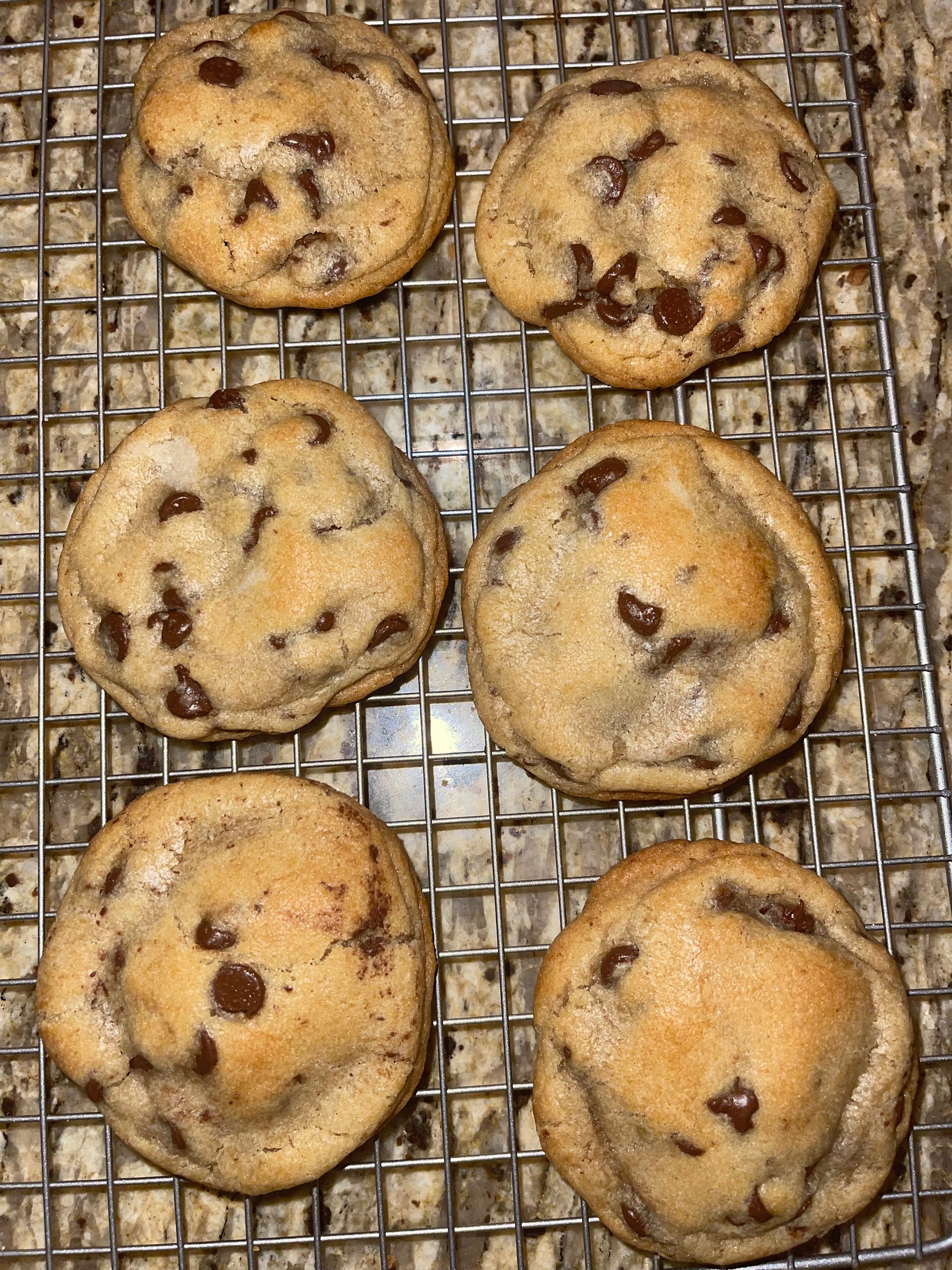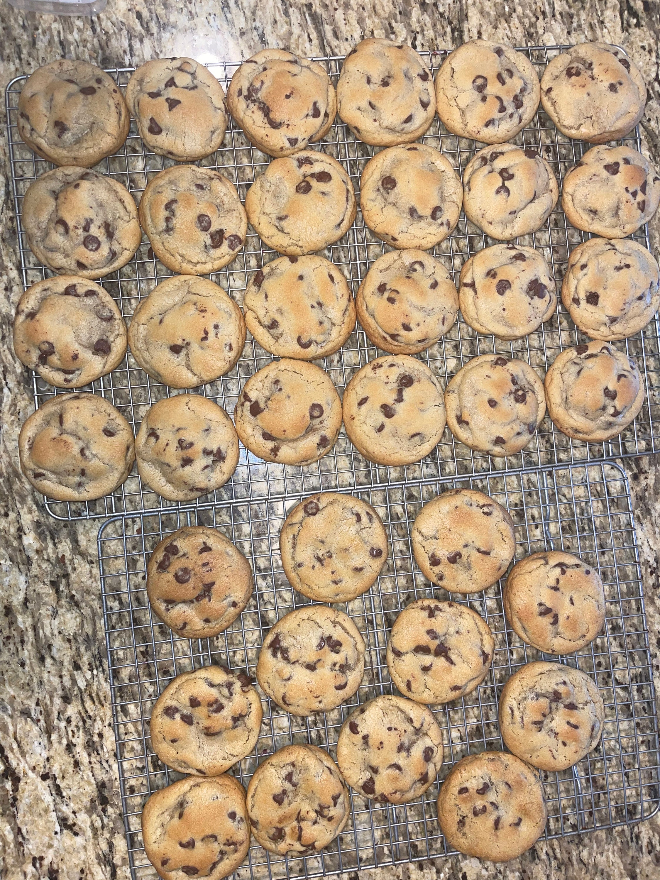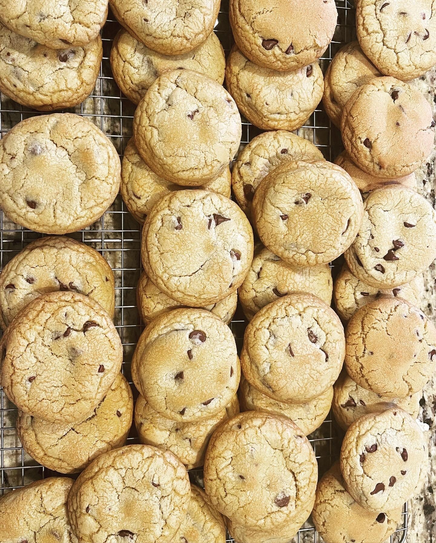 Homemade chocolate chip cookies with Hershey’s chocolate chips. Cookies are made fresh daily and shipped on same day. Each cookie dough ball is handcrafted with exactly 3 tablespoons of dough and lightly baked to perfection. These cookies are the perfect consistency for the cookie dough lovers / they can truly be considered “half baked” with a soft gooey center.