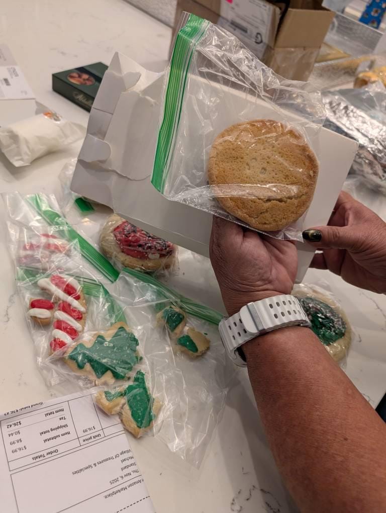 I honestly thought the cookies came individually heat-sealed in their packaging but instead I got a lot of broken cookies in a bunch of opened sandwich bags. The actual cookie is so good, they just did not tend to properly packaging them out for delivery so if you order just be forewarned because I had intentions for them to be on display during the family holidays and I don't think an order like this is something to rely on, unfortunately. The way they were packaged I would honestly wonder if the seller ever even got their food handlers card.